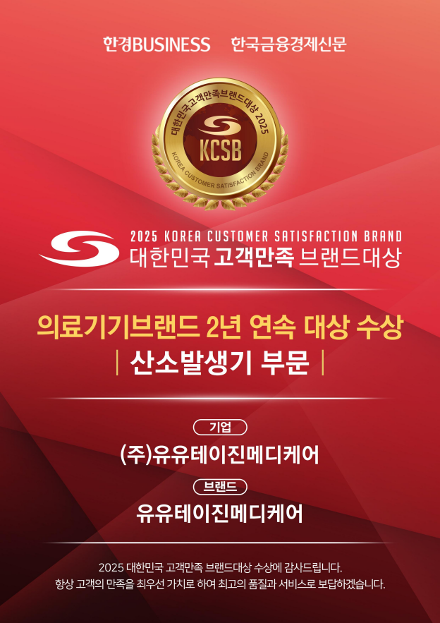 유유테이진메디케어가 ‘2025 대한민국 고객만족브랜드대상’ 산소발생기 부문을 2년 연속 수상했다.